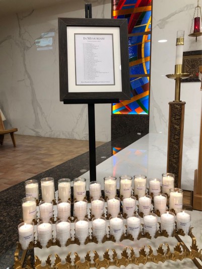華人天主堂的廖煥中執事在彌撒中協助Cantú主教主祭並誦念亡者姓名。點燃的31 支蠟燭象徵追思懷念去年一年三十一位因為暴力而喪失的生命。